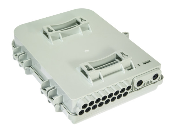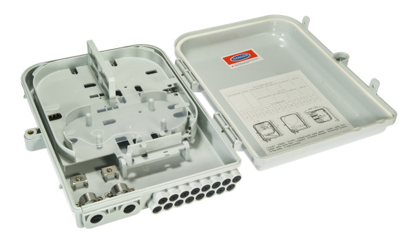 Optička kutija sa 2 ulaza i 16 izlaza za optičke kablove. Koristi kablovsku uvodnicu koja omogućava usmeravanje vlakna bez prethodnog presecanja. Unutar se nalazi preklopni nosač na koji je postavljen okvir za adaptere. Ispod ležišta postoje žlebovi u koje možete postaviti zavarene spojeve. Na samom dnu, ispod ležišta, postoji slobodan prostor u koji možete staviti rezervni kabl ako koristite hvataljke (nisu uključene).